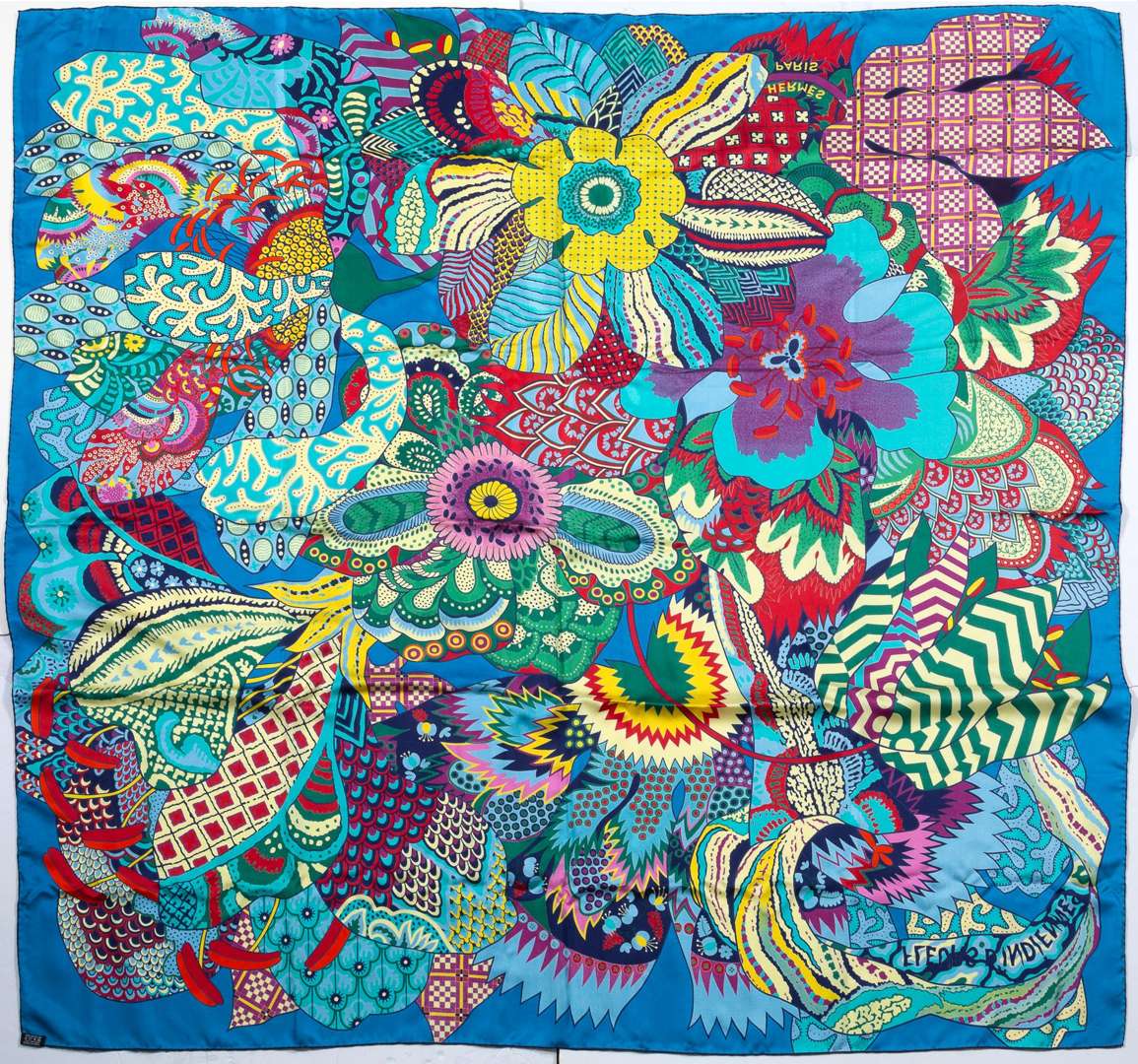 Grand carré en soie dessiné par Aline Honoré dans les tons de bleu, rouge, vert et jaune.