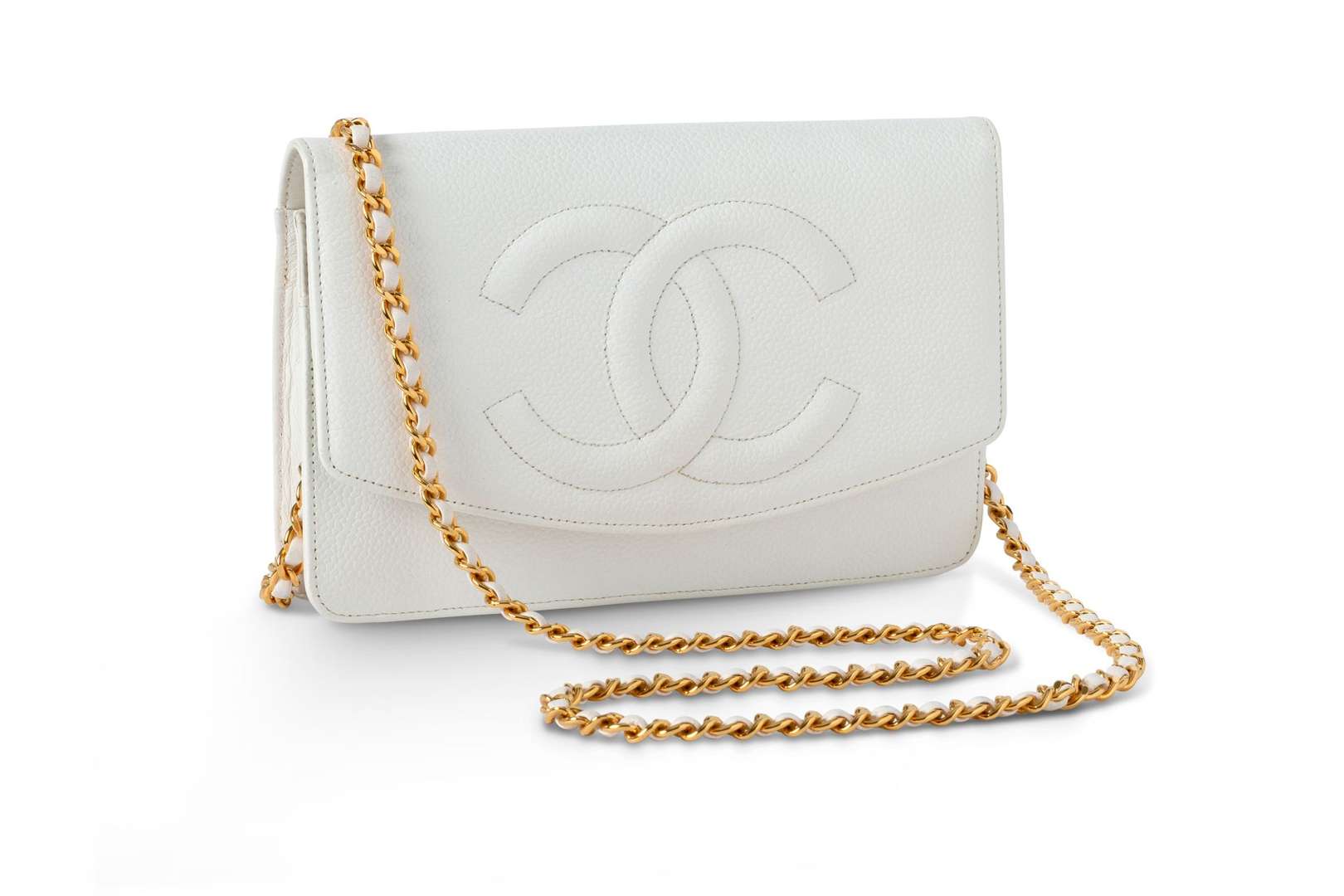 Sac-pochette en cuir grainé blanc. Anse chaine en cuir blanc et garniture en métal doré. Une poche plaquée et zippée au dos.