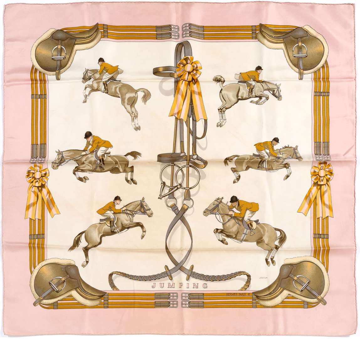 Carré de soie "Jumping", dessiné par Philippe Ledoux, à bordure rose pâle et dominante beige.