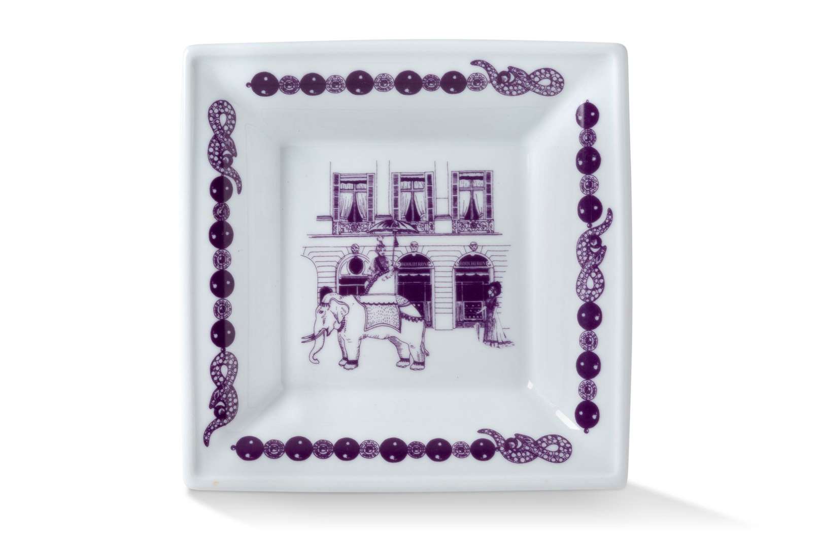 Cendrier en porcelaine et émail violet à décor de la devanture du magasin.