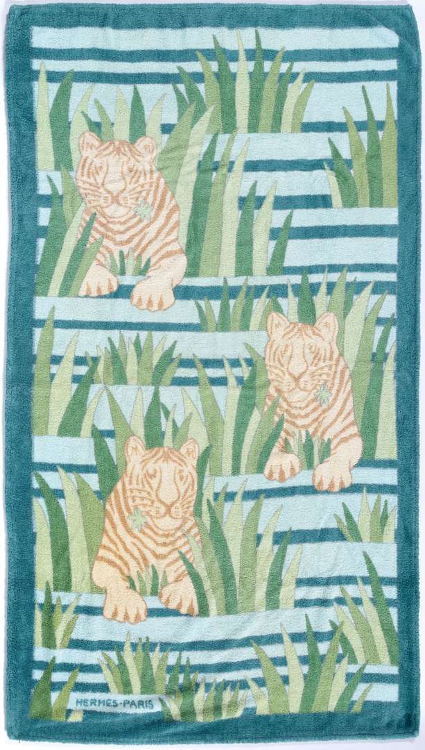 Serviette de bain en coton éponge, à motifs de trois tigres à dominantes vertes. Dim. : 140 x 85 cm