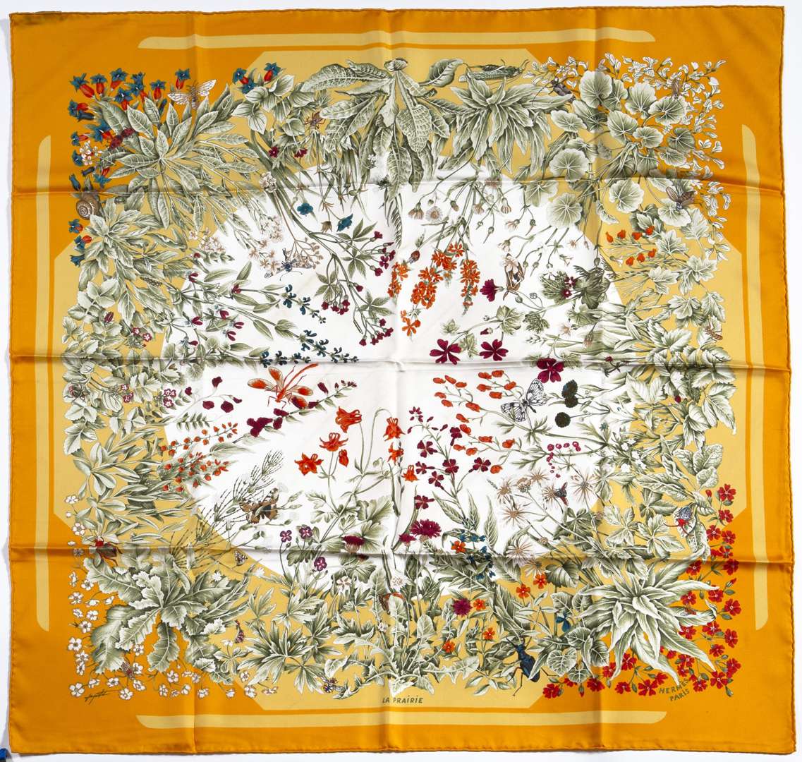 Carré de soie dessiné par Antoine de Jacquelot en 1994, dans les tons de orange et vert.