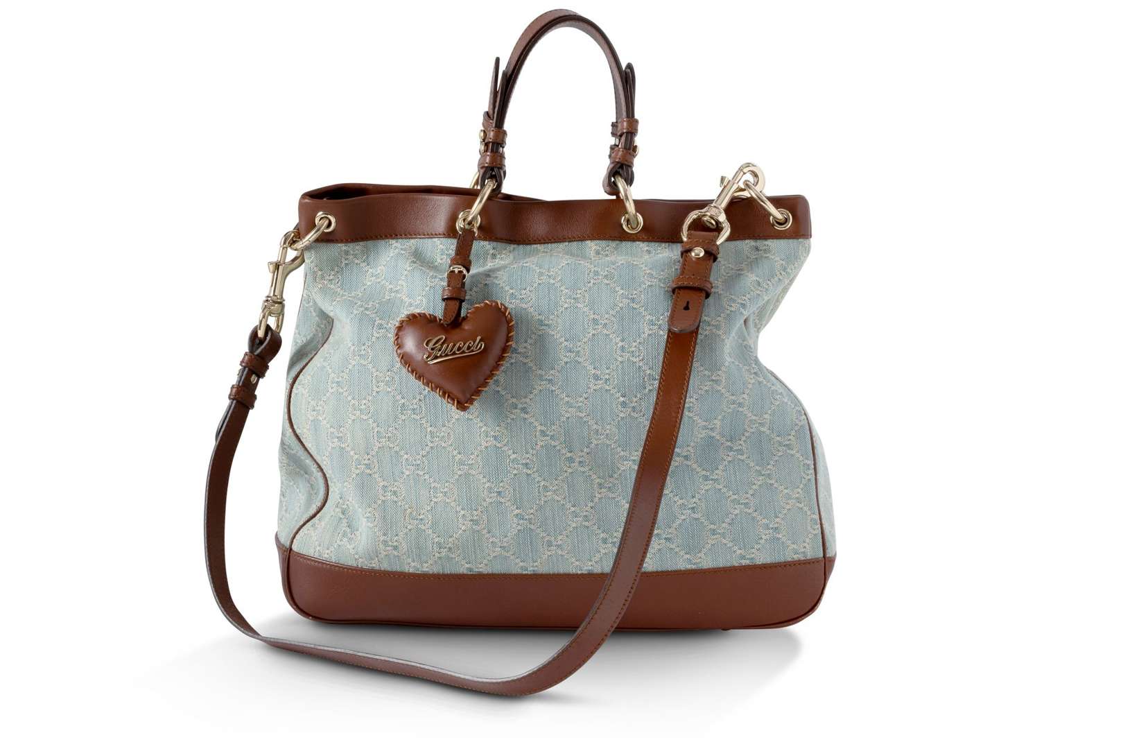 Elément de sac "coeur" en cuir marron, griffé "Gucci" en métal doré.