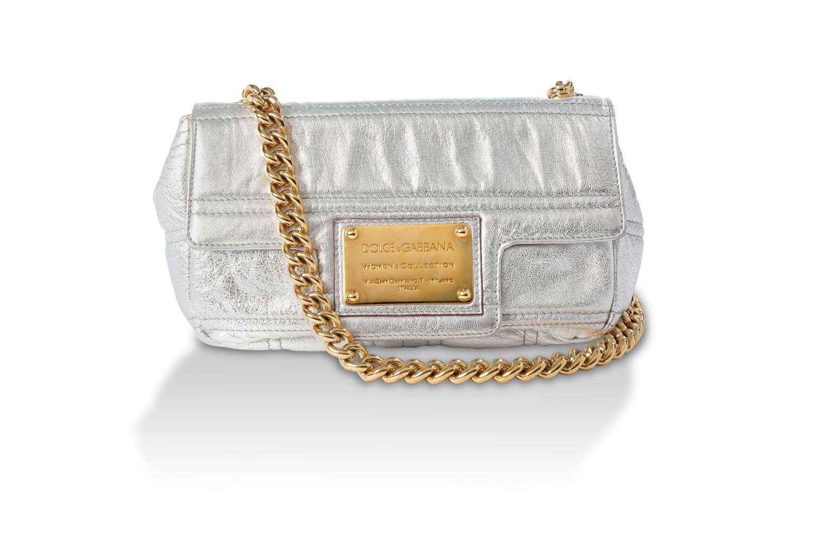 Sac en cuir argenté, anse-chaine en métal doré. Garniture en métal doré. ~