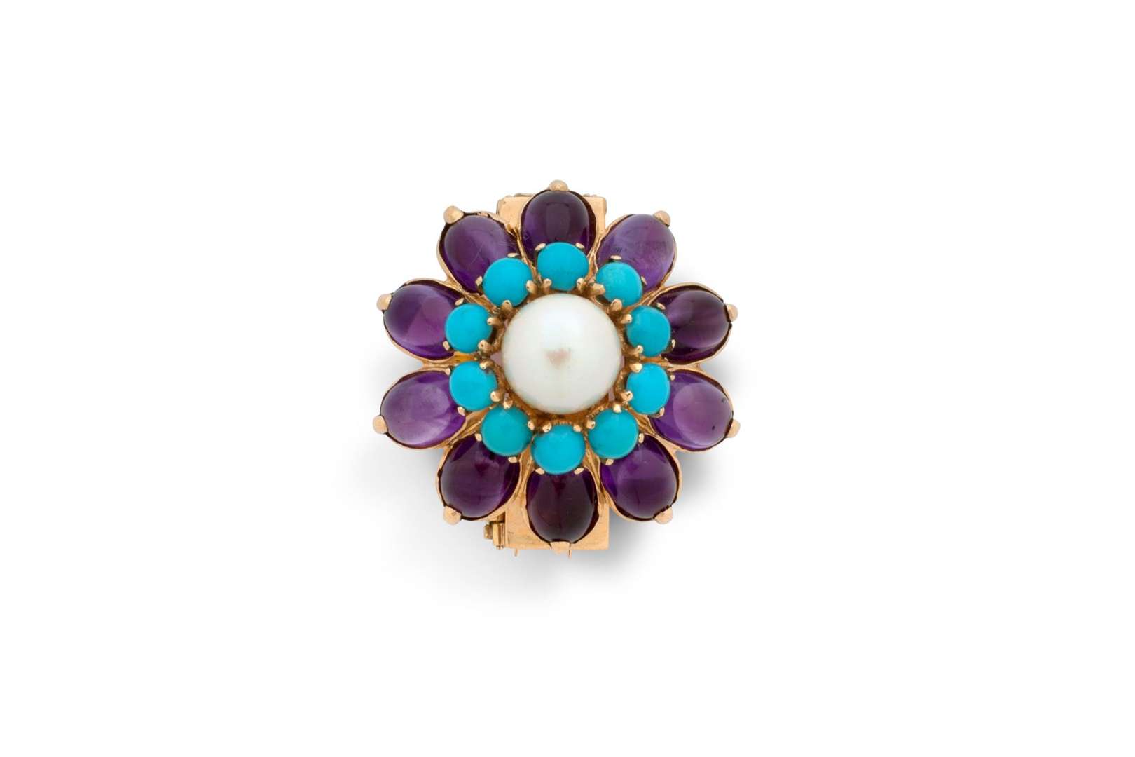 Améthystes cabochons, turquoises cabochons et perle de culture