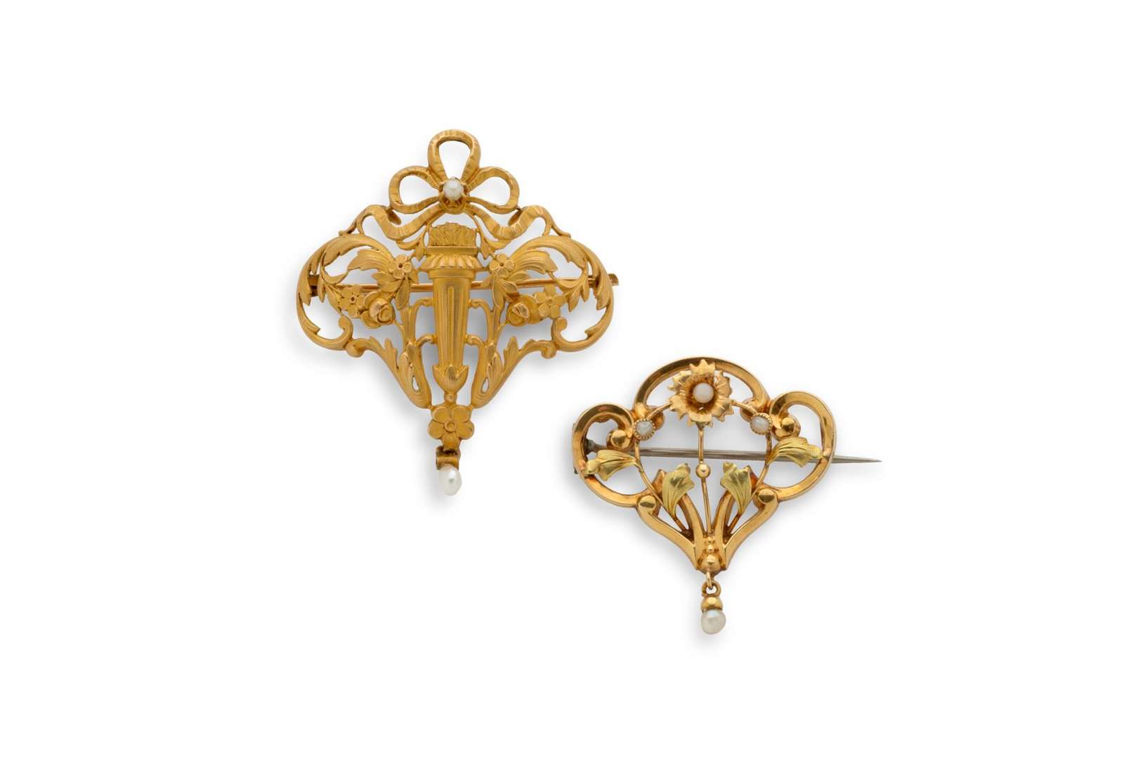 - Broche guirlande, perle et or 18k (750), Dim. : 4 x 4 cm env.