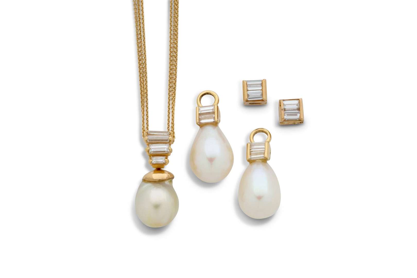 - Deux pendentifs, perles de culture, diamants baguettes, or 18k (750) - Pb. : 7.5 g
