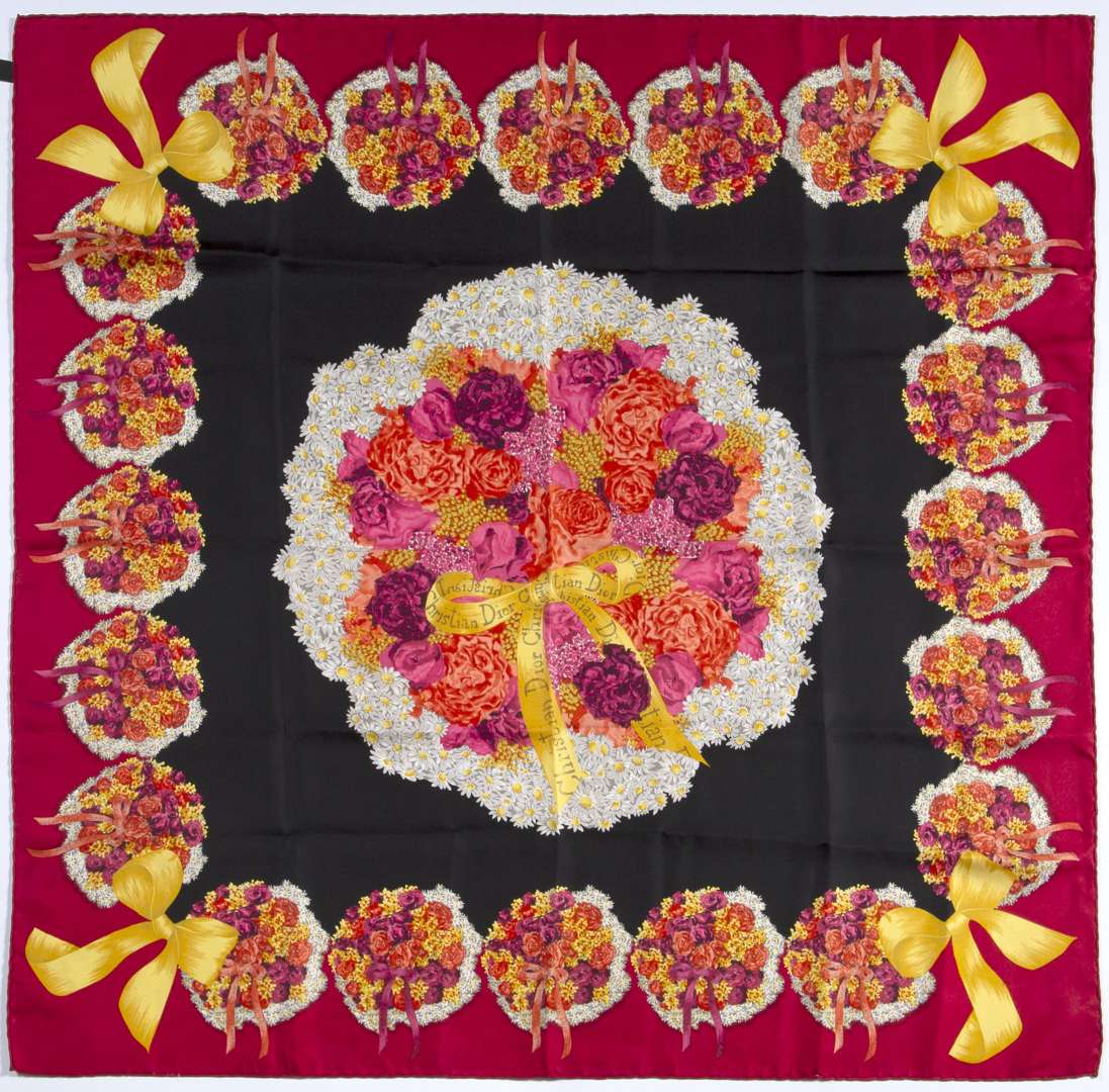 Foulard en soie dans les tons de rouge et noir à décor de fleurs et noeud.