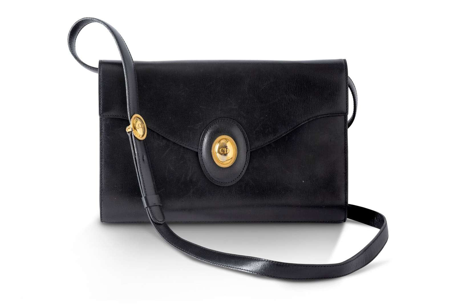 Sac en cuir noir, bandoulière ajustable et amovible. Garniture en métal doré. Ouverture par rabat et bouton pression.