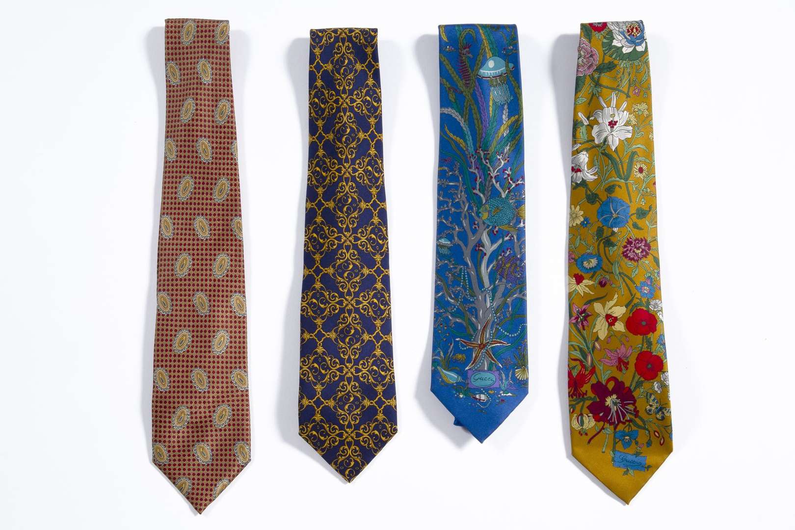 - GUCCI - Cravate en soie dans les tons de moutarde à motifs fleuris. Dim. : 146 x 9 cm env.