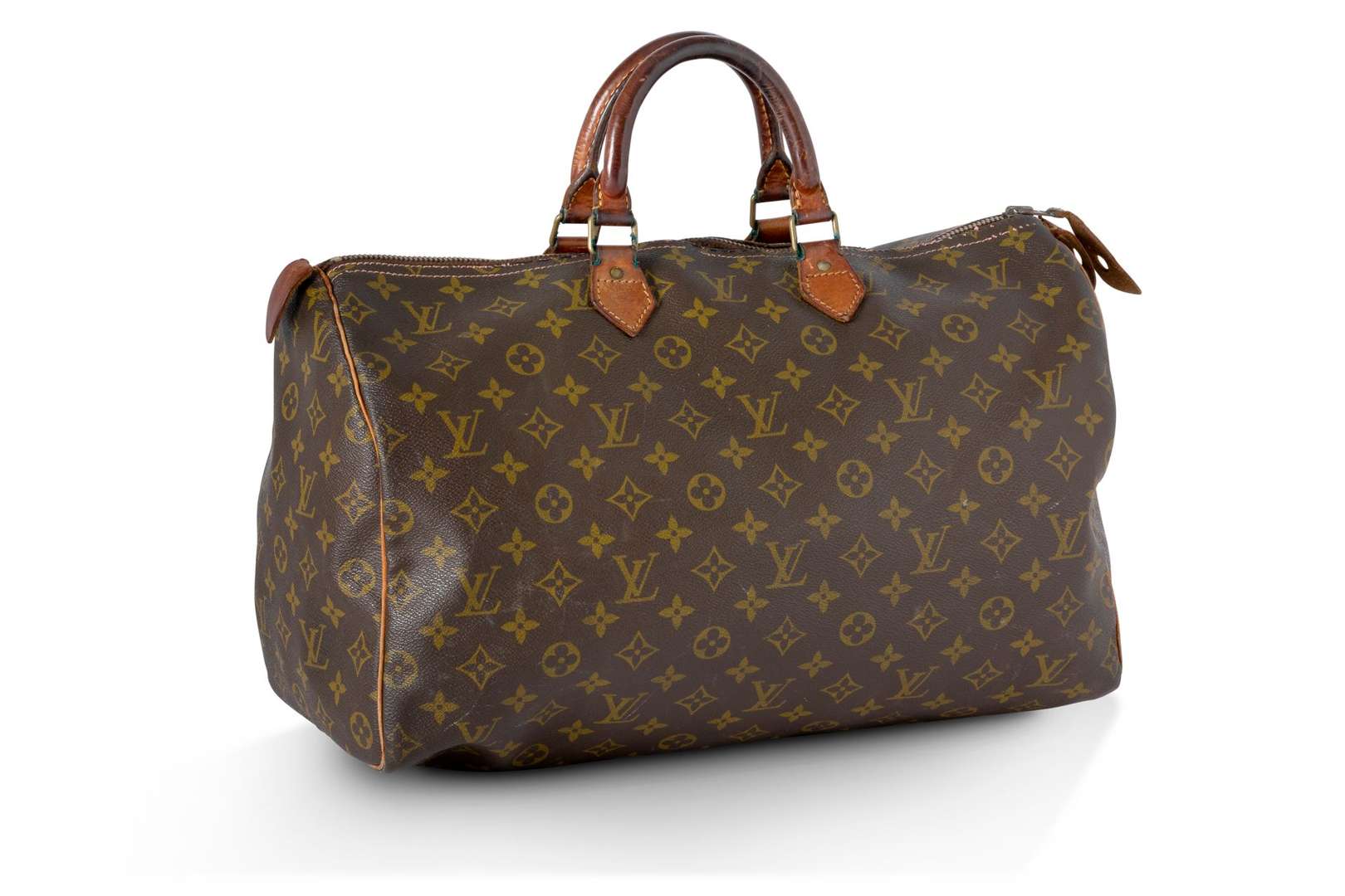 Sac en toile monogramée et cuir naturel. Double-poignée et garniture en métal doré.