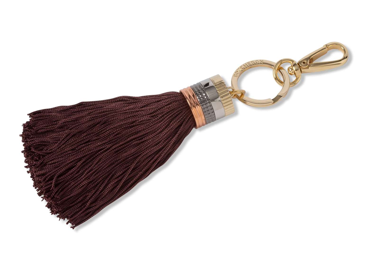Porte-clef pompons en métal doré et tissu marron.