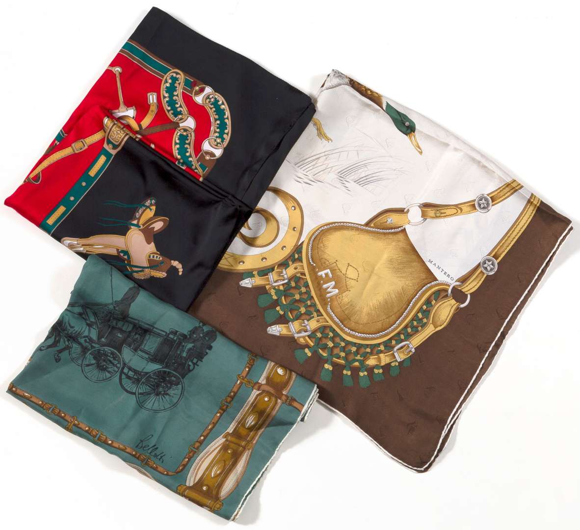 - Carré en soie représentant une calèche. Dim. : 76 x 76 cm env. Signé Bellotti.