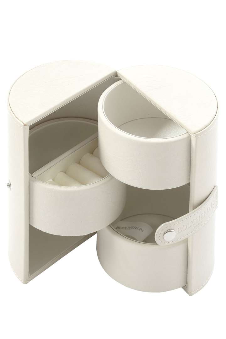 Ecrin à bijoux en simili cuir écru, de forme ronde, garniture en métal argenté.