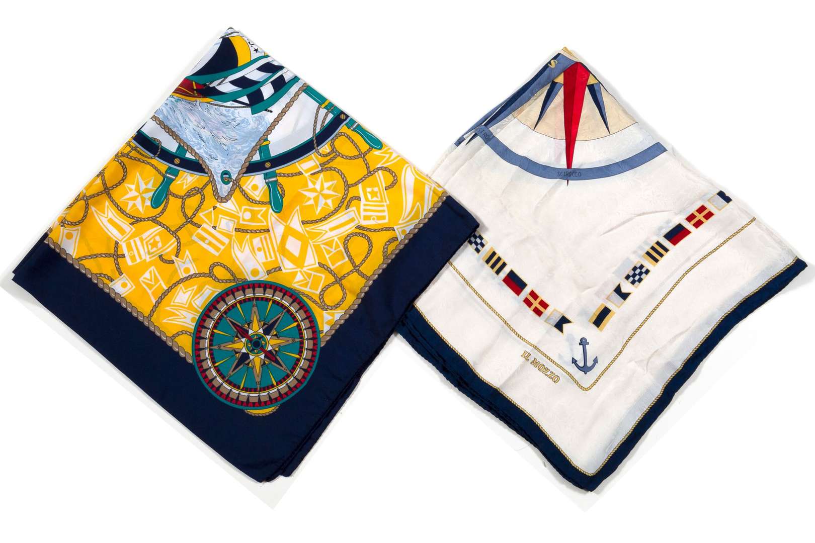 - Foulard en polyester representant un voilier dans les tons de jaune et marine. Dim. : 91 x 86 cm env.