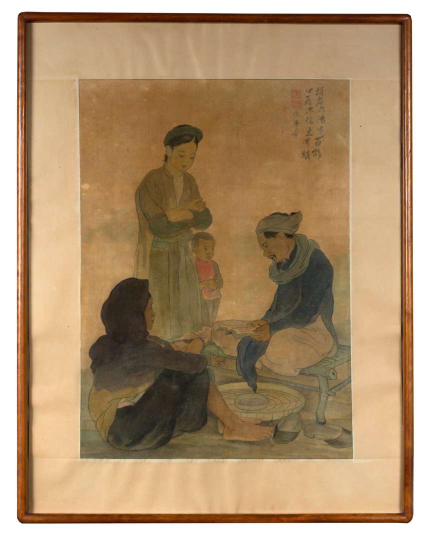 Encre et couleurs sur soie, signée Trần Bình et annotée en haut à droite d'une citation évoquant des principes de savoir-vivre