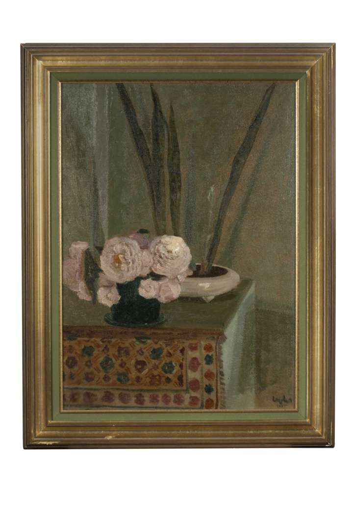 Virtuose du pinceau, Lê Phổ s’affirme comme l’un des meilleurs élèves de l’École des Beaux-Arts de l’Indochine qu’il rejoint dès sa création en 1925. Son talent lui permet d’assister Victor Tardieu, le directeur de l’École, lors de l’Exposition Coloniale de Paris en 1931. C’est à cette occasion que le jeune artiste découvre la peinture occidentale qu’il admire au Louvre ou lors de ses voyages en Europe. Réalisée en 1935, Nature morte aux pivoines et plante en pot s’inscrit dans sa première période picturale. Son style se construit et l’artiste explore ses possibilités. Si la peinture à l’huile est son médium favori dans la dernière partie de sa carrière, elle est à cette époque relativement rare. Le peintre n’en utilisait que peu au Vietnam, non seulement pour des raisons techniques -la peinture à l’huile ne supportant pas le climat humide - mais aussi la préférence des commanditaires pour la peinture sur soie. Les oeuvres de la fin des années 1920 jusqu’au milieu des années 1930, se caractérisent par la douceur et l’harmonie des ocres, les figures académiques mêlant l’iconographie vietnamienne et la composition occidentale comme la toile réalisée à la Cité internationale universitaire de Paris. Lê Phổ, riche de ses études à Hanoï et de son voyage en Europe, garde à l’esprit la subtilité des détails et la valeur symbolique des motifs pour se forger son propre style. Optant pour un format classique, Lê Phổ perpétue ici la tradition des natures mortes. Il s’appuie sur une composition sage où pivoines et plante verte sont disposées harmonieusement sur une table recouverte en partie par un tapis. La perspective est classique et la palette réaliste. Suivant les codes initiés par les maîtres anciens, le jeune vietnamien prouve qu’il maîtrise les codes de la peinture occidentale.