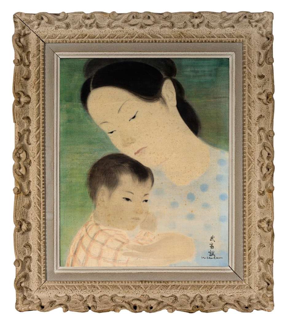Remarquable témoignage du travail des années avant-guerre, Mère et enfant, circa 1942 - 1944 par Vũ Cao Đàm illustre la tendresse d’une mère tenant son enfant dans les bras. Dans cette peinture, exposée à Alger sous l’impulsion du galeriste André Romanet en 1944, Vũ Cao Đàm dépeint l’attitude de la protagoniste avec raffinement et élégance. Celle-ci se meut sur ce fond homogène qui, avec grâce, lui donne vie. Ainsi, s’en découle un chromatisme précieux, produit de l’agencement savant des tons bleus. La précision du trait, visible en particulier dans le travail précis et fin de la chevelure, témoigne de l’excellence de l’enseignement reçu par l’artiste à Hanoï.