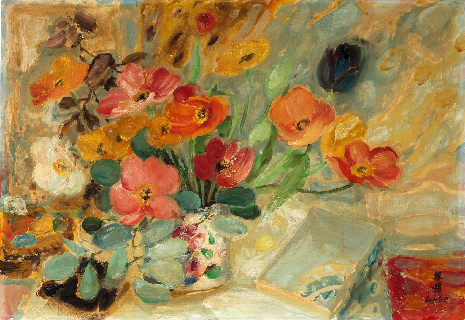 Bouquet de renoncules sur un entablement est une huile sur soie réalisée par Lê Phổ. L’artiste riche d’un enseignement exigeant reçu aux beaux-arts et des influences multiples résultant de ses rencontres et découvertes dans les musées, montre ici un témoignage de son admiration pour les impressionnistes français. Par sa palette colorée, rappelant celle de Cézanne, et sa touche vive et spontanée, Lê Phổ parvient à rendre vivante sa composition. Les pétales jaunes, oranges, rouges, verts s’ordonnent parfaitement pour former les fleurs, tandis qu’en arrière-plan, les tons de verts et nuances d’ocre rehaussent le dessin du bouquet faisant de ce dernier, le sujet de l’oeuvre. Nous pouvons rapprocher cette composition de celle illustrée ci-contre, par laquelle Lê Phổ rend hommage à Matisse – artiste qu’il admirait particulièrement – en plaçant une lettre dédicacée, sur le côté droit de l’entablement.
