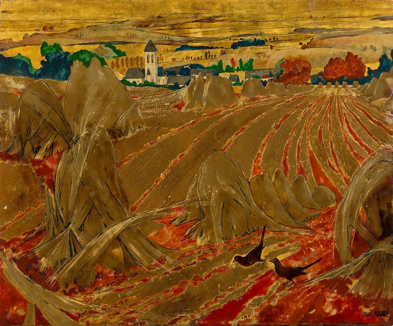 Dans cette oeuvre spécifique, Alix Aymé représente un paysage rural avec des champs récemment moissonnés et au loin, un clocher et son village. Bien que le sujet ne soit pas typiquement vietnamien, l’artiste utilise une technique qu’elle a développée lors de son long séjour en Asie, et parvient à intégrer des éléments caractéristiques des post impressionnistes français, tels les meules ou bottes foins qui sont en effet des sujets récurrents parmi les impressionnistes et post impressionnistes comme Monet, Sisley ou encore Gauguin.
