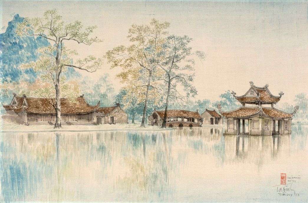 Encre et couleurs sur soie, signée, située et datée «Chua Thay Ha Tay, 1983» en bas à droite. «HANOÏ»