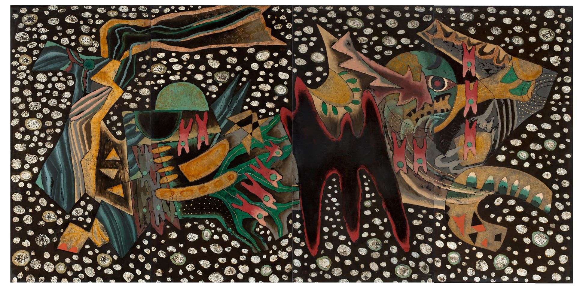Laque avec coquille d'oeufs, ensemble de quatre panneaux signé et daté en bas du 3e en partant de la gauche.