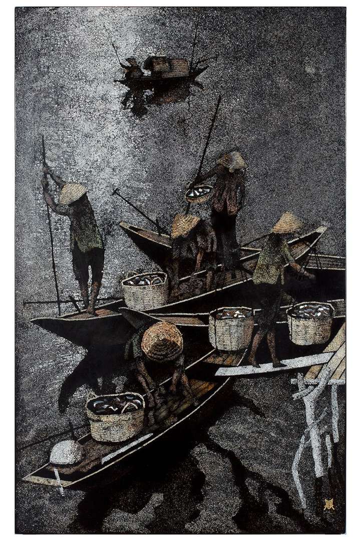 Laque, réhauts de nacre et coquille d'oeuf, monogrammée en bas à droite