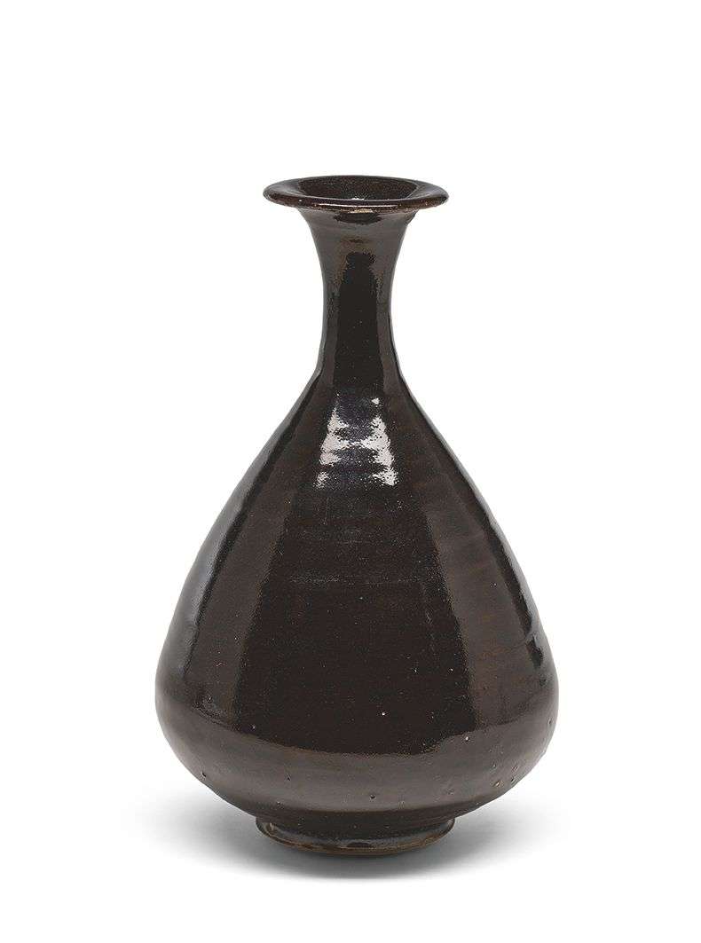 La panse piriforme reposant sur un court pied, et s'élançant en un haut col évasé. L'ensemble avec une belle couverte noire uniforme.