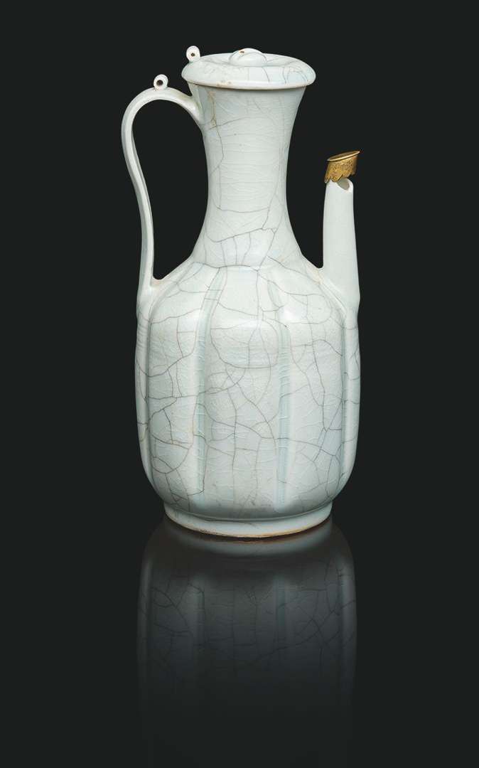 Le corps moulé polylobé, s'élançant en un haut col évasé sur lequel s'appuie une large anse courbée, le bec verseur incurvé.