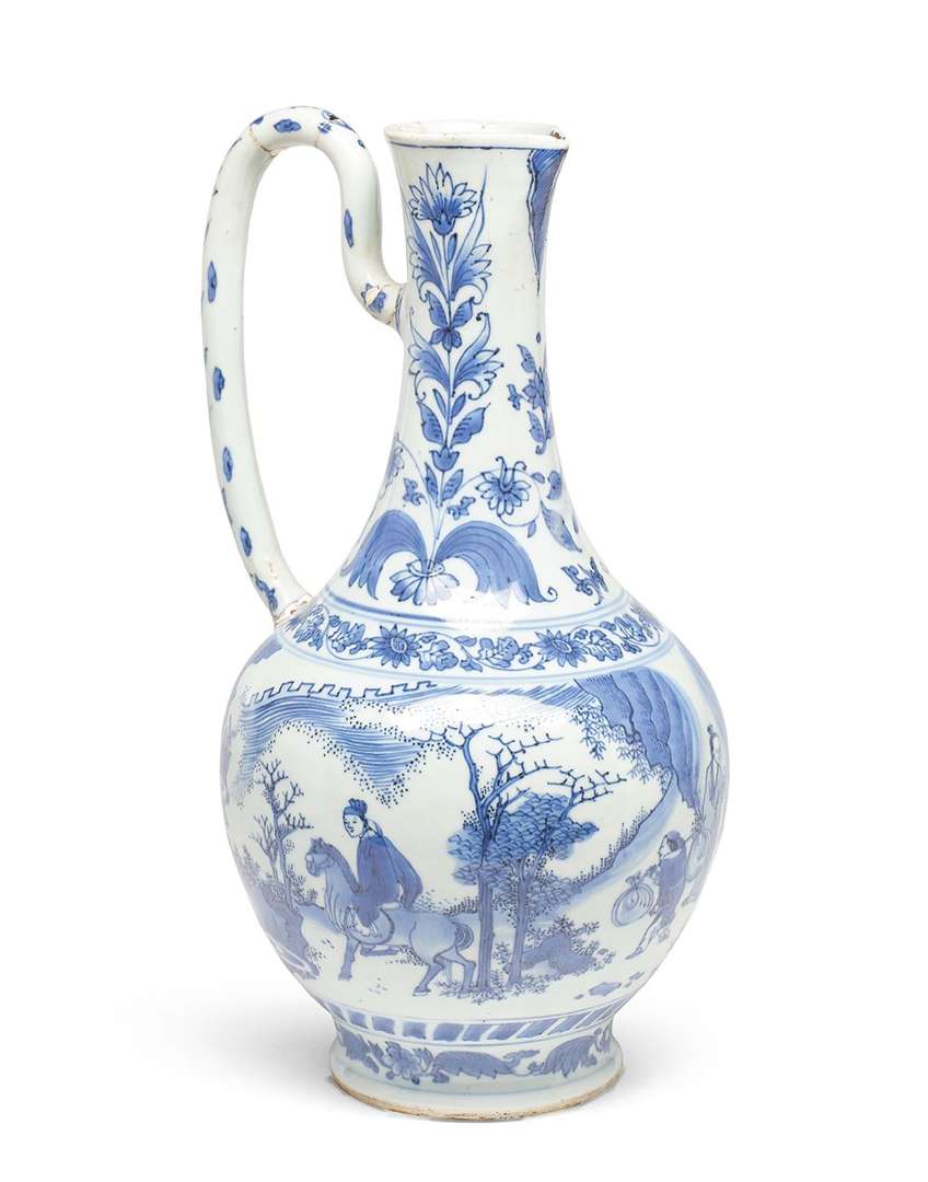 La panse globulaire s'élançant un long col évasé à décor de tulipes sur lequel s'appuie une haute anse. Le décor principal figure une rencontre entre deux lettrés voyageant avec leurs serviteurs.