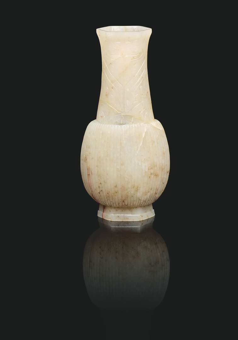 La panse de forme ovoïde aplatie ornée de cannelures, s'élançant un haut col évasé hexagonal décoré de motifs archaïsants.