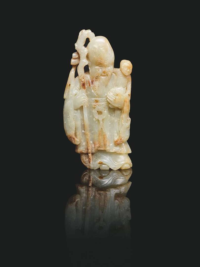 Figurant Shoulao s'appuyant sur son bâton et tenant un enfant dans ses bras.