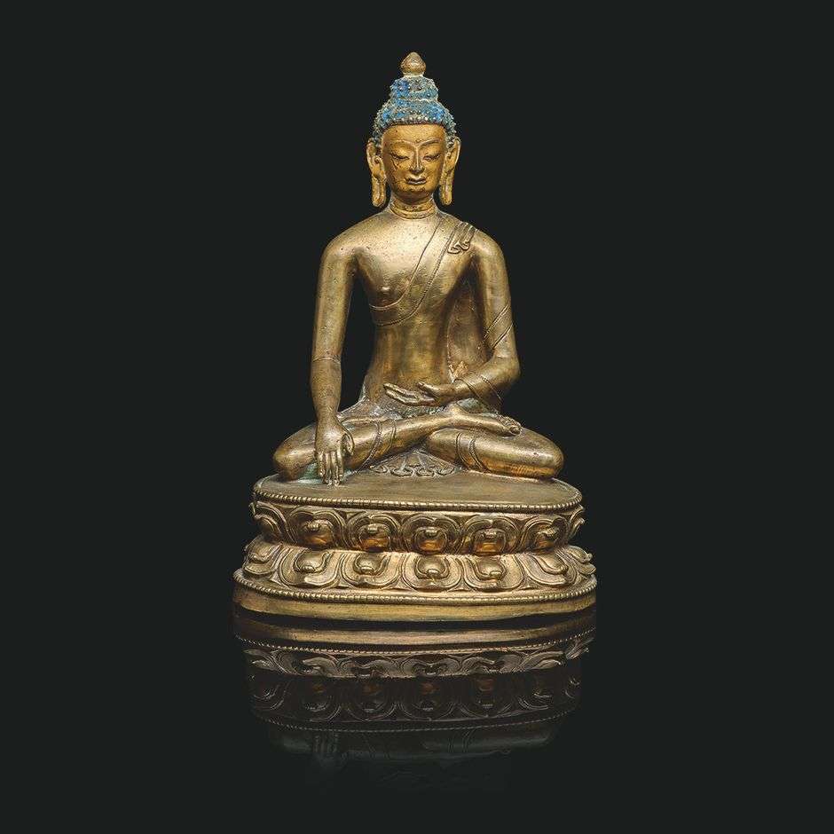 Le bouddha assis en vajrasana sur une double base lotiforme, les mains en bhumiparsha mudra, vêtu d'un fin dhoti lui couvrant l'épaule gauche et retombant en éventail sur la base. Le visage fin, doré à froid, à l'expression sereine, encadré par des oreilles aux lobes très étirés. La base non scellée.