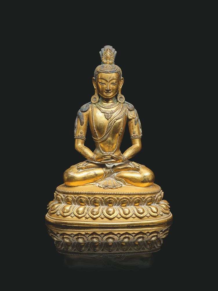 Le bouddha assis en vajrasana sur une double base lotiforme, les mains reposant en dhyanamudra sur les jambes, vêtu d'un fin dhoti, paré de nombreux bijoux, le visage encadré par de lourdes boucles d'oreilles, la chevelure coiffée en un haut chignon ornementé. L'expression sereine et bienveillante. La base non scellée.