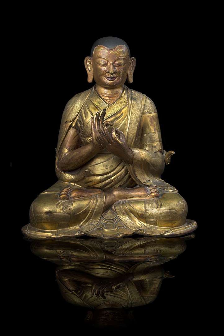 Cette statue, rare et spectaculaire par ses dimensions mais également par sa qualité, témoigne de la maîtrise atteinte par les artisans himalayens. Ceux-ci sont passés maîtres dans l'art de la fonte, mais également dans la ciselure et le repoussé. Une riche dorure au mercure caractéristique de la région rehausse l'ensemble. Cette oeuvre s'inscrit dans un contexte de renouveau de l'influence du bouddhisme tibétain au sein de l'empire chinois. Le bouddhisme tibétain avait connu une expansion sans précédent au XIIIe siècle au travers des conquêtes mongoles, notamment auprès des nomades d'Asie extrême-orientale, mais était également devenu religion d'état en Chine sous la dynastie Yuan (1279 - 1368). En 1644, les Mandchous, population nomade du nord de la Chine, prennent le pouvoir en Chine et fondent la dynastie Qing (1644 - 1911). Leurs empereurs, fervents bouddhistes, vont s'employer à largement diffuser et mécéner le bouddhisme tibétain dans leur empire, dont le territoire atteint au XVIIIe siècle une taille inégalée. Il s'ensuit d'importants échanges artistiques, politiques et diplomatiques entre les monastères tibétains et le pouvoir chinois comme en témoigne notre pièce, dont la qualité la destinait probablement à un riche temple ou monastère.