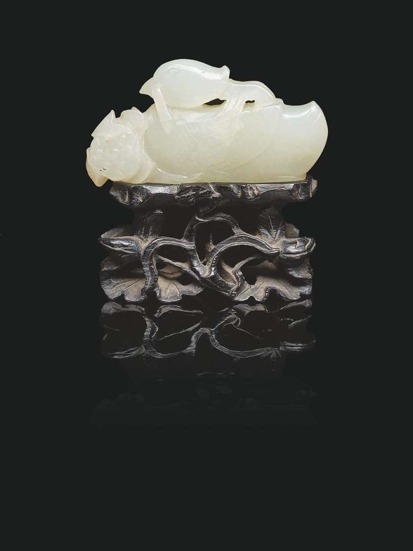 Figurant un canard mandarin tenant une tige de lotus dans son bec. Avec son socle en bois postérieur.