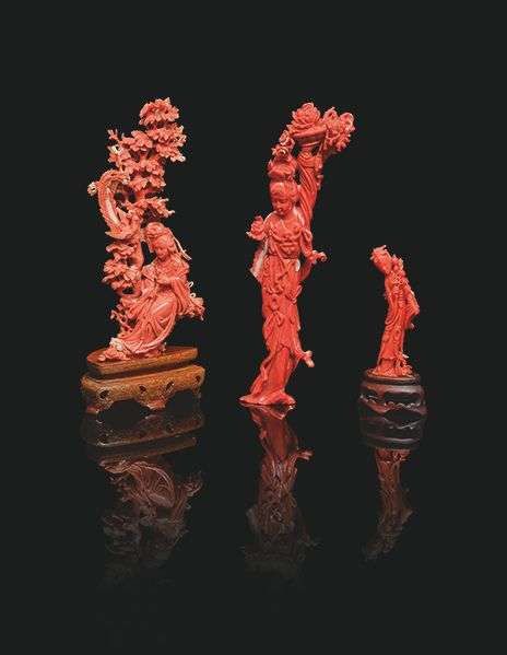 Figurant des immortelles taoïstes, l'une accompagnée d'un phénix, les deux autres tenant des paniers et branches fleuries.