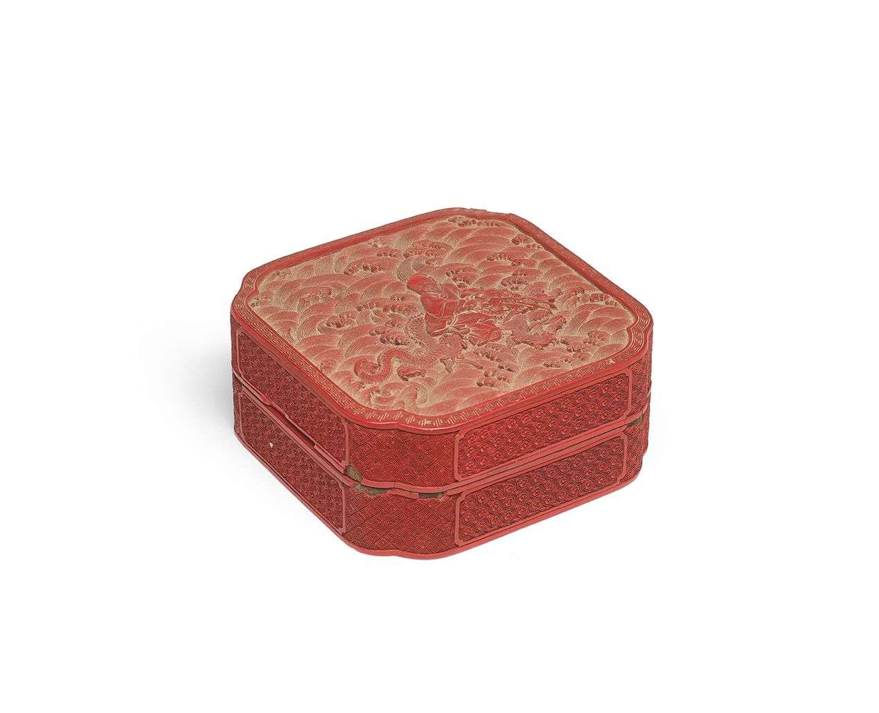 De forme carrée avec les coins redentés, le couvercle orné d'un immortel taoïste chevauchant un dragon au-dessus de flots tumultueux. L'ensemble encadré par une frise de grecques finement sculptée.