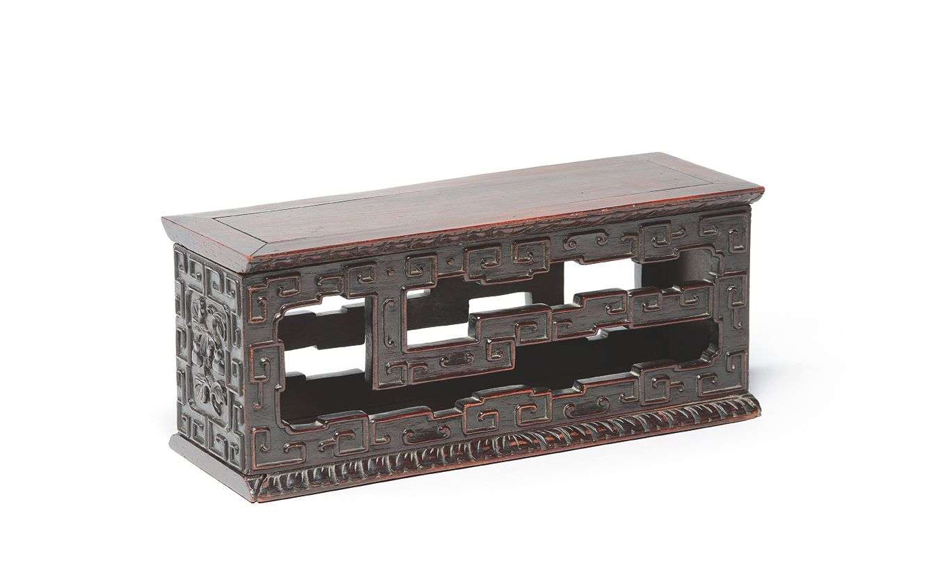 De forme rectangulaire, à décor ajouré de grecques, et double-gourdes sur les petits côtés. L'ensemble reposant sur une base lotiforme.