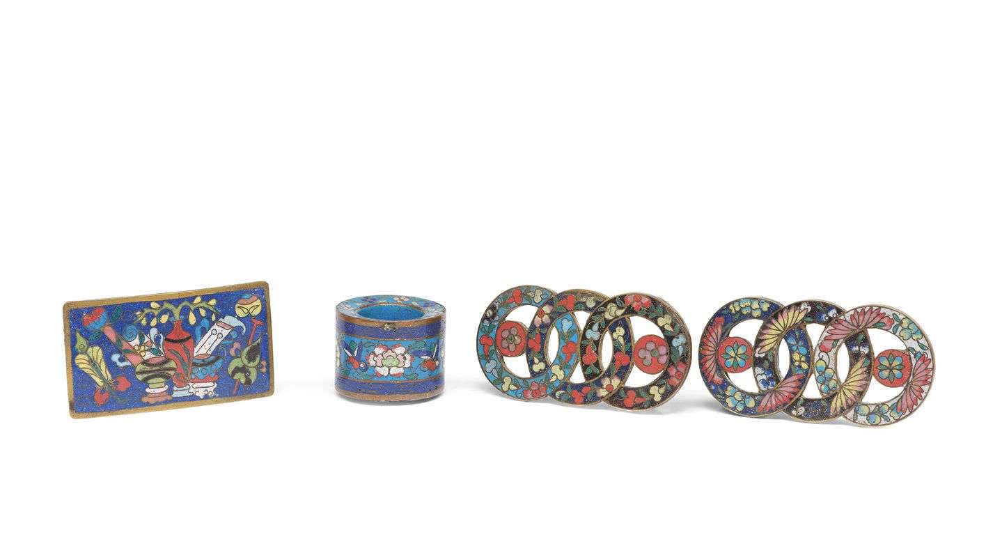 Trois boucles de ceintures et une bague d'archer en émaux cloisonnés