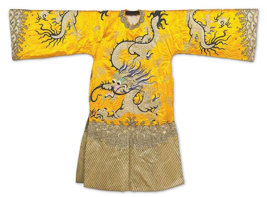 Imitant les robes de cour de la dynastie Nguyen, à décor brodé aux fils dorés et fils polychromes de grands dragons mang pourchassant la perle sur fond jaune orangé, au-dessus de lishui et flots tumultueux.