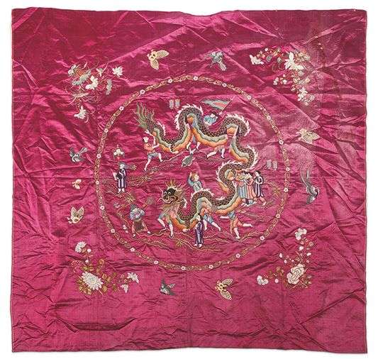 Décorée aux fils polychromes de soie sur fond pourpre d'une procession de personnages exécutant la danse du dragon dans une réserve circulaire. L'ensemble complété par des branches fleuries, papillons et oiseaux volants autour de la composition centrale.