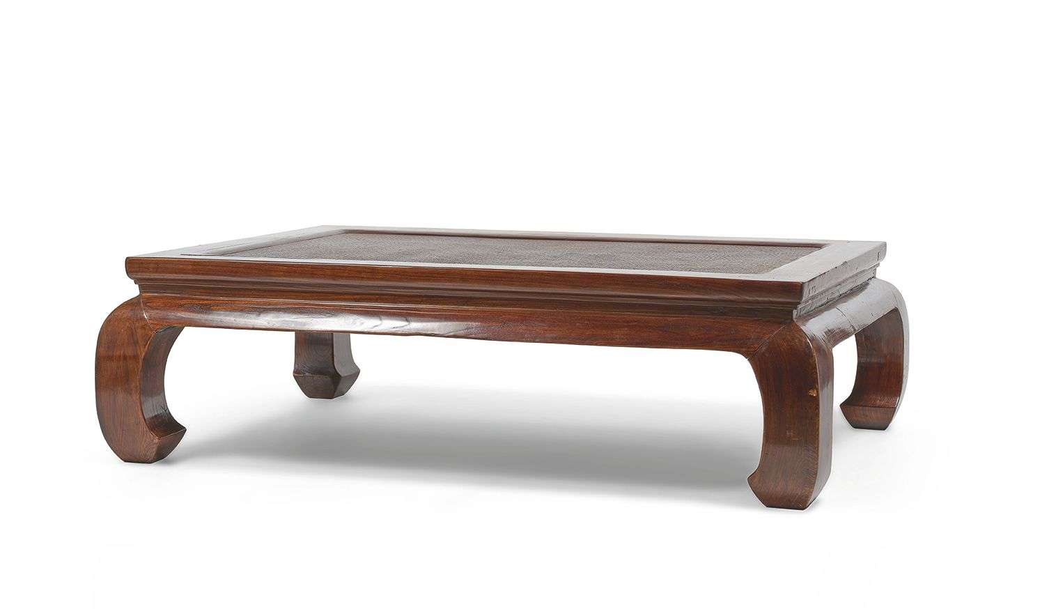 Reposant sur quatre pieds arqués, le plateau recouvert de rotin tressé laqué.