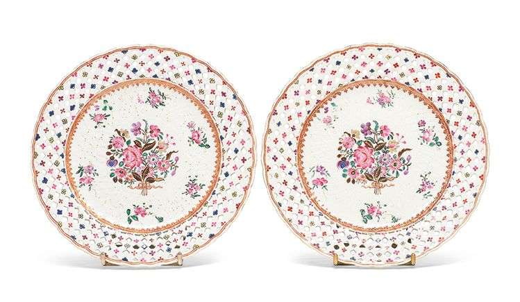 Le centre décoré aux émaux de la famille rose d'un bouquet de fleurs épanouies parmi lesquelles se dissimulent les armes de la famille De Robien. L'aile ajourée à décor d'un semis de fleurs peintes et moulées.