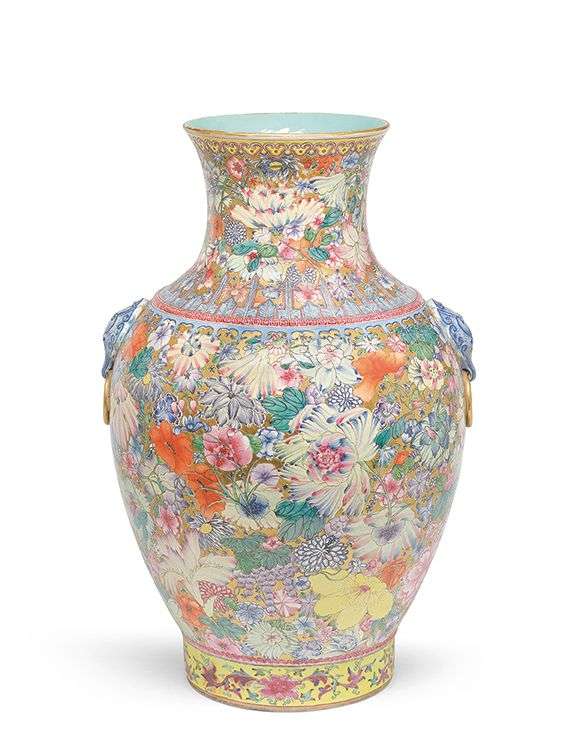 Le décor « mille-fleurs », qui juxtapose une multitude de variétés de fleurs (chrysanthème, pivoine, rose, lotus, magnolia, iris, aster...) avec un sens aigu du détail et de l'observation, est une prouesse artistique du XVIIIe siècle chinois car chaque famille d'émaux doit cuire à une température particulière. Ce tour de force technique est rendu possible par la maîtrise du « pourpre de Cassius », qui permet l'obtention de la couleur rose, et de l'émail blanc opaque permettant de décliner des nuances pastels. Le présent vase reprend la composition du célèbre vase impérial « mille-fleurs » de la collection Ernest Grandidier conservé au Musée National des Arts Asiatiques Guimet (G 3344).