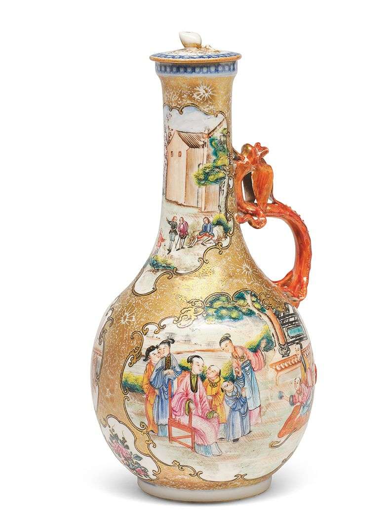 La panse sphérique s'étirant en un haut col sur lequel s'appuie une anse en forme de dragon, le corps décoré de grandes réserves peuplées de personnages dans un jardin. L'ensemble complété par des petites réserves abritant des paysages et vues européennes et se détachant sur un fond de rinceaux floraux à l'or.