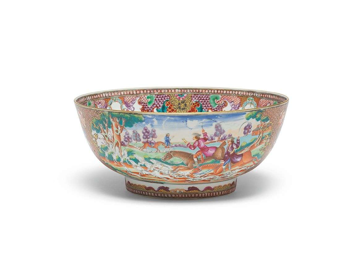 Bol à punch aux « scènes de chasse » en porcelaine décorée « à la palette mandarin »