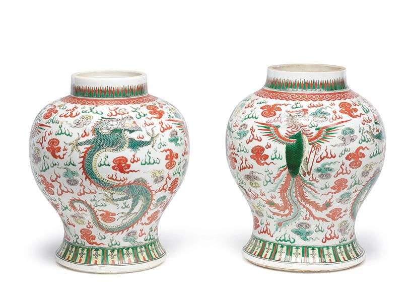 De forme balustre, à décor de couples de dragons et phénix parmi les nuées et les flammes. La base avec un double-cercle en bleu sous couverte. Avec leurs socles en bois ajouré postérieurs.
