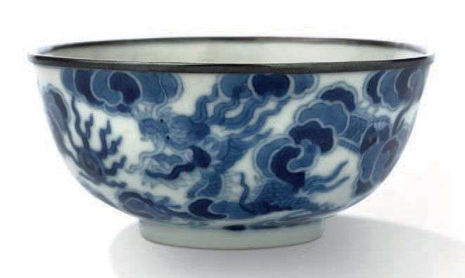 = Bol en porcelaine bleu-blanc à décor de deux dragons à cinq griffes pourchassant le perle sacrée parmi les nuages. la lèvre cerclée de métal. La base avec une marque
