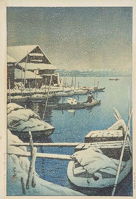Signée « Hasui » et avec le sceau de l'artiste « Sui », le sceau de l'éditeur Watanabe Shozaburo (Hotei B) en marge inférieure droite. Titrée en marge inférieure gauche et datée en marge inférieure gauche (Fait en Showa 6 [1931], Décembre). Encadrée postérieurement.